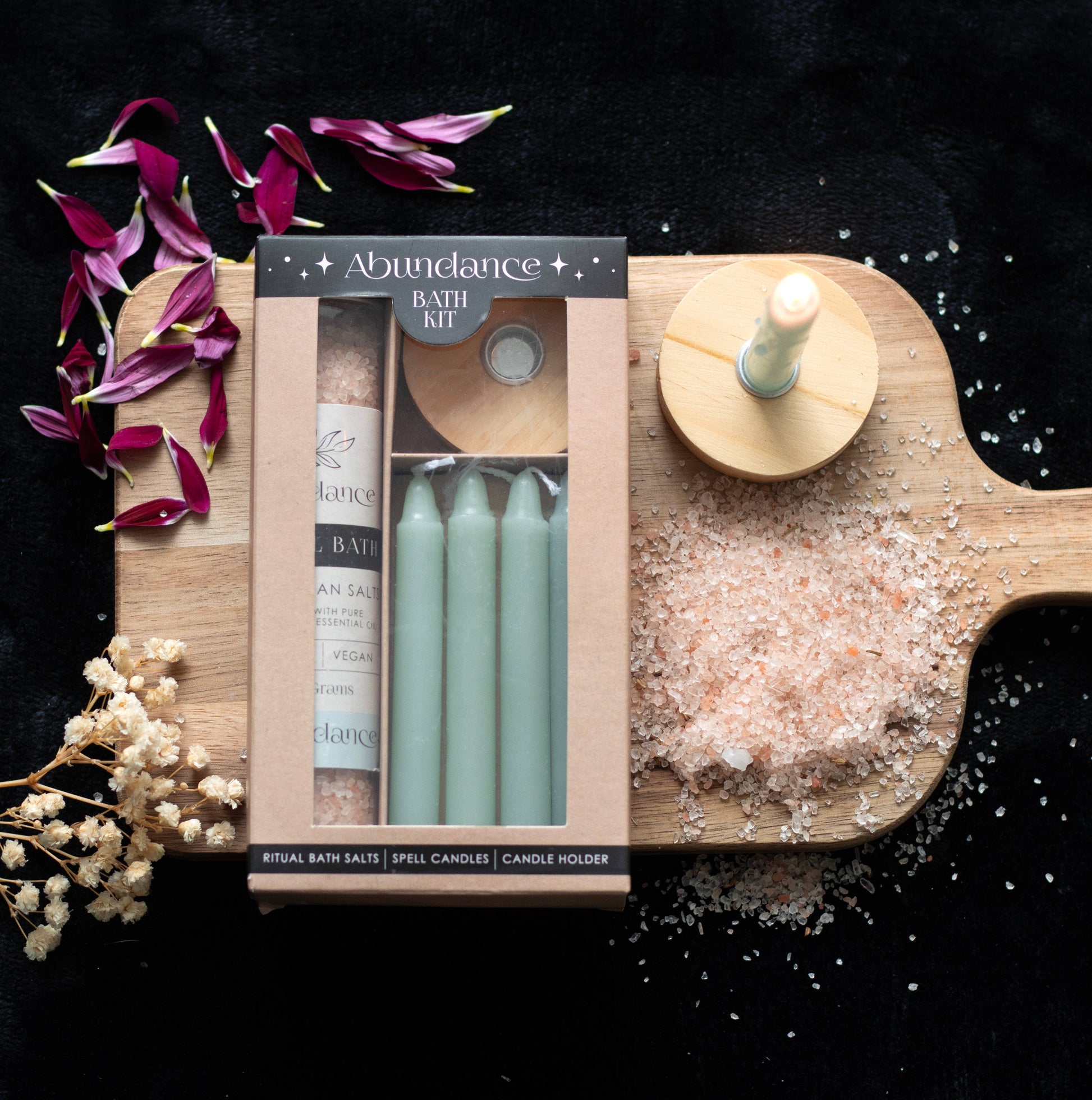 Encourage abundance, prosperity and gratitude with the Abundance Ritual Bath Kit. The kit features 100g of ritual bath salts, pack of 4 green spell candles and a candle holder. The natural and vegan bath salts are made with Himalayan salt and infused with the calming aroma of clary sage essential oil. Visualise a goal, light a green spell candle, and manifest the end result while indulging in a cleansing bath. Designed by Something Different as part of the Herbal Magick range.