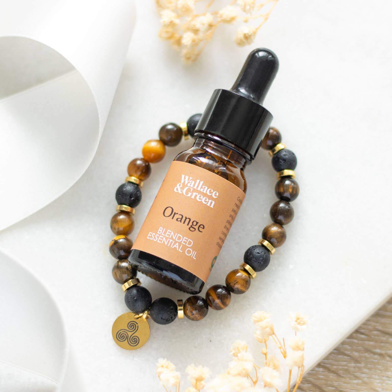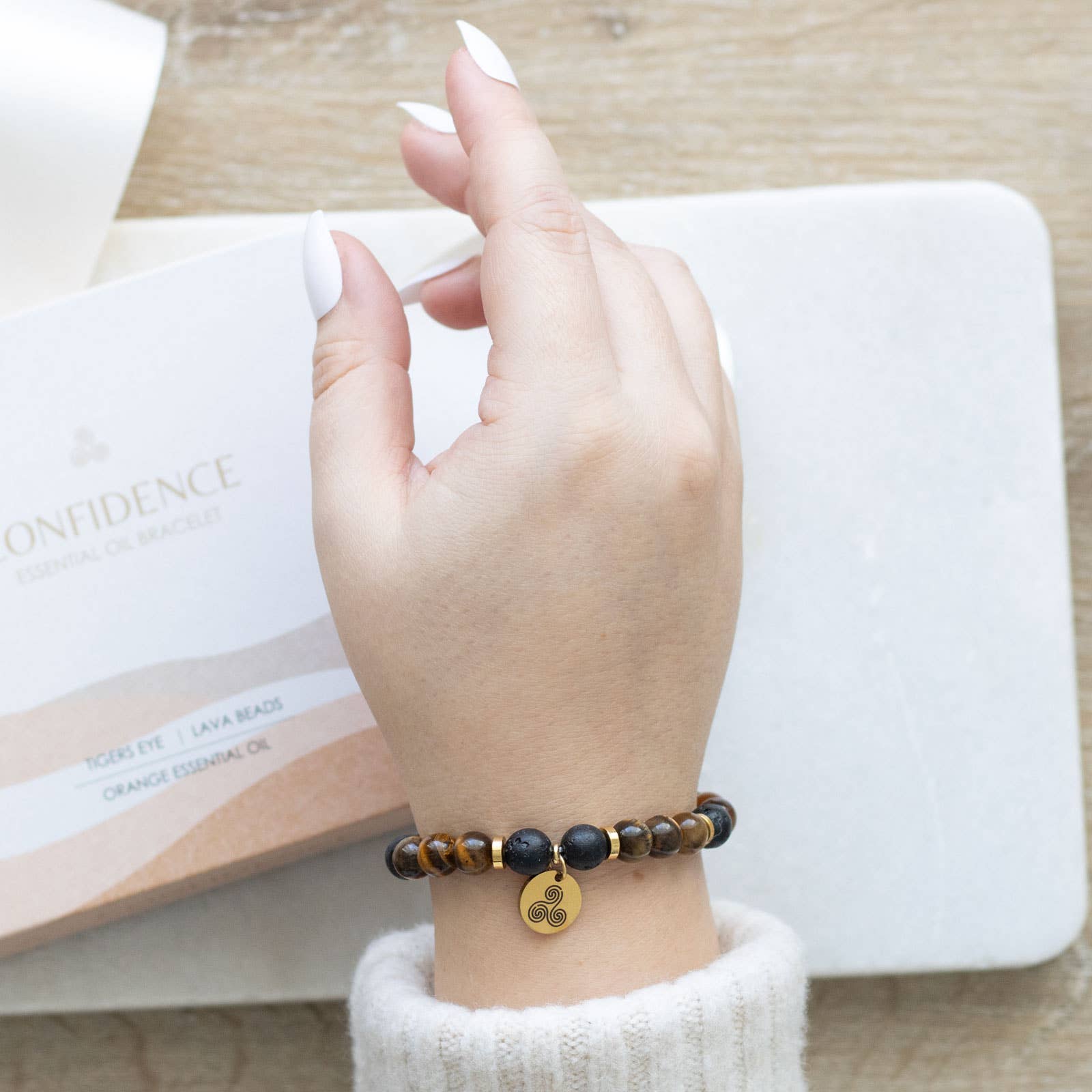 This confidence lava bead bracelet and essential oil gift set uses aromatherapy to enhance the metaphysical healing power of crystals. Crafted with natural tiger's eye and lava beads, the bracelet serves as a diffuser for the included orange oil, enhancing confidence and positivity. The addition of the Triskelion charm symbolises strength, courage, and resilience, making it an ideal gift for those in need of an extra boost. Crafted with durable materials and packaged in a luxury gift box, this elasticated bracelet combines beauty and functionality, offering a thoughtful present for various occasions. Designed by Something Different Wholesale.