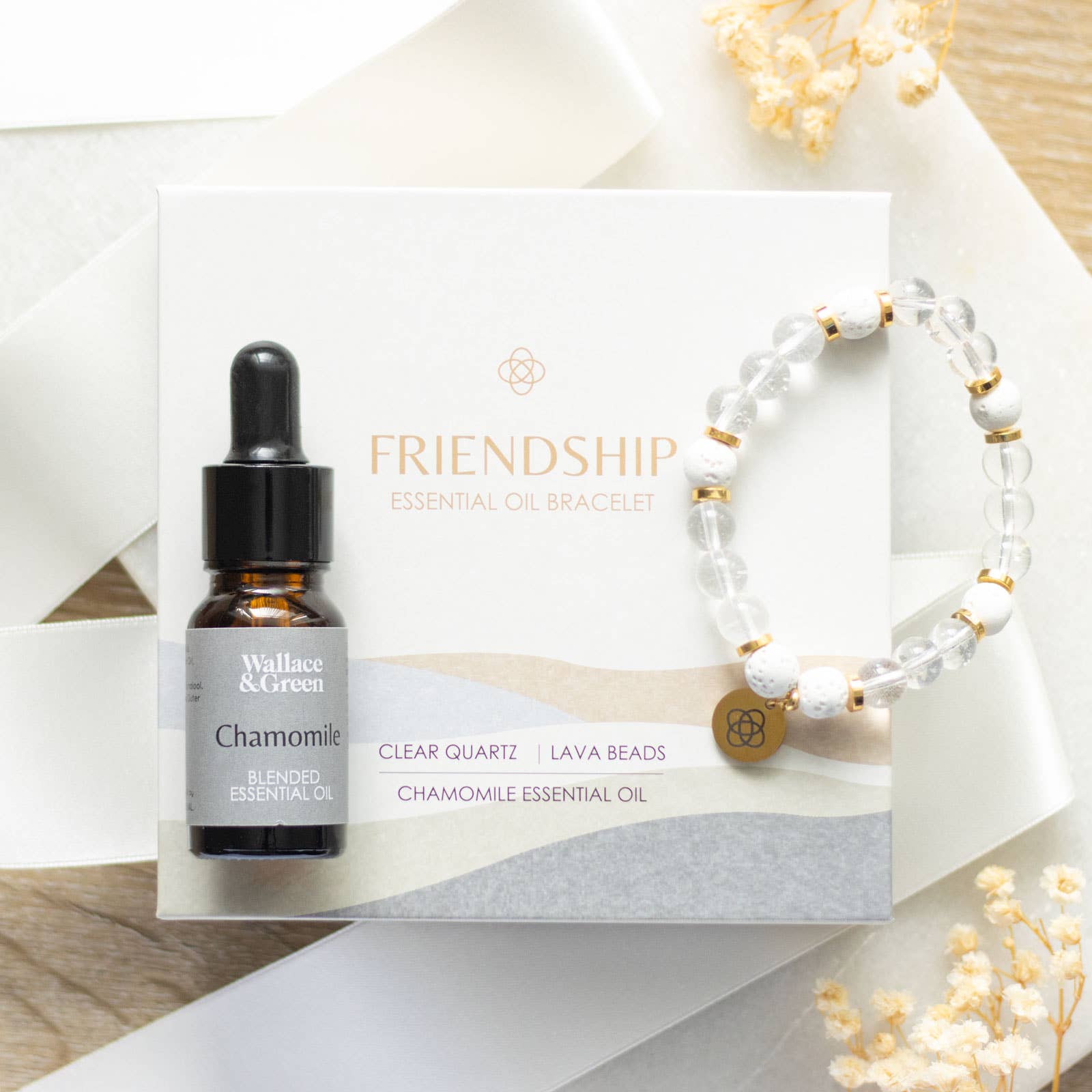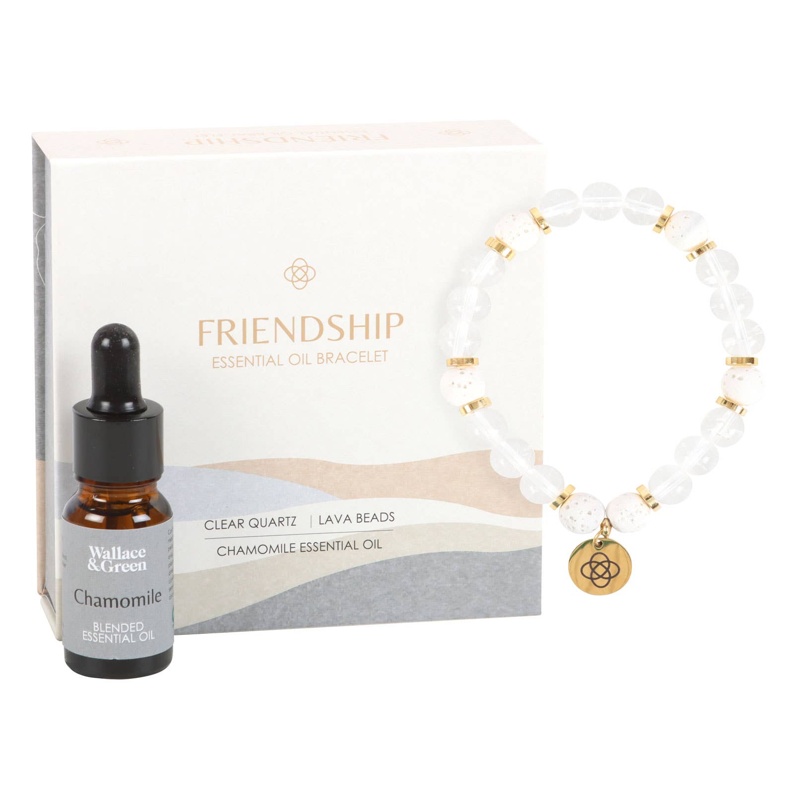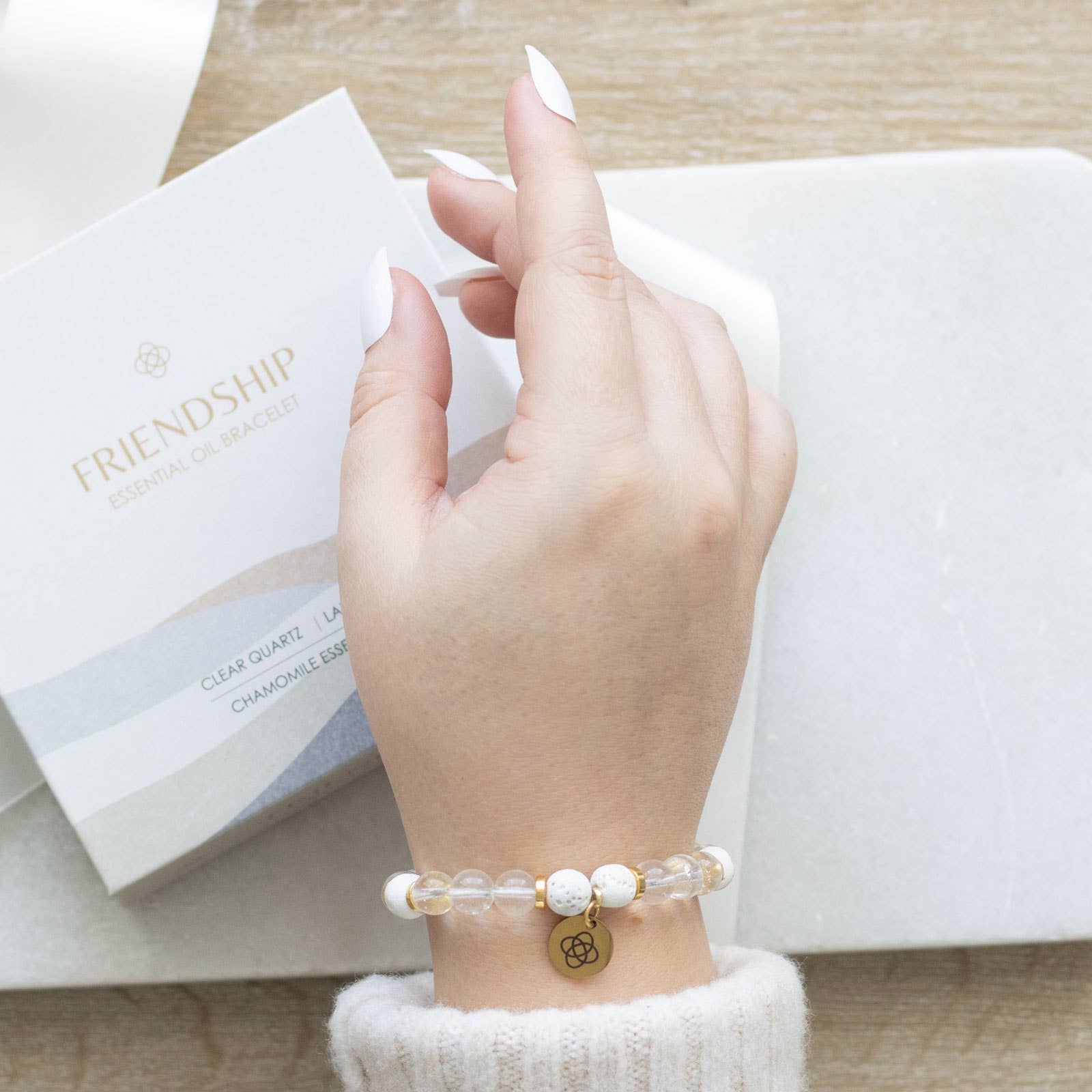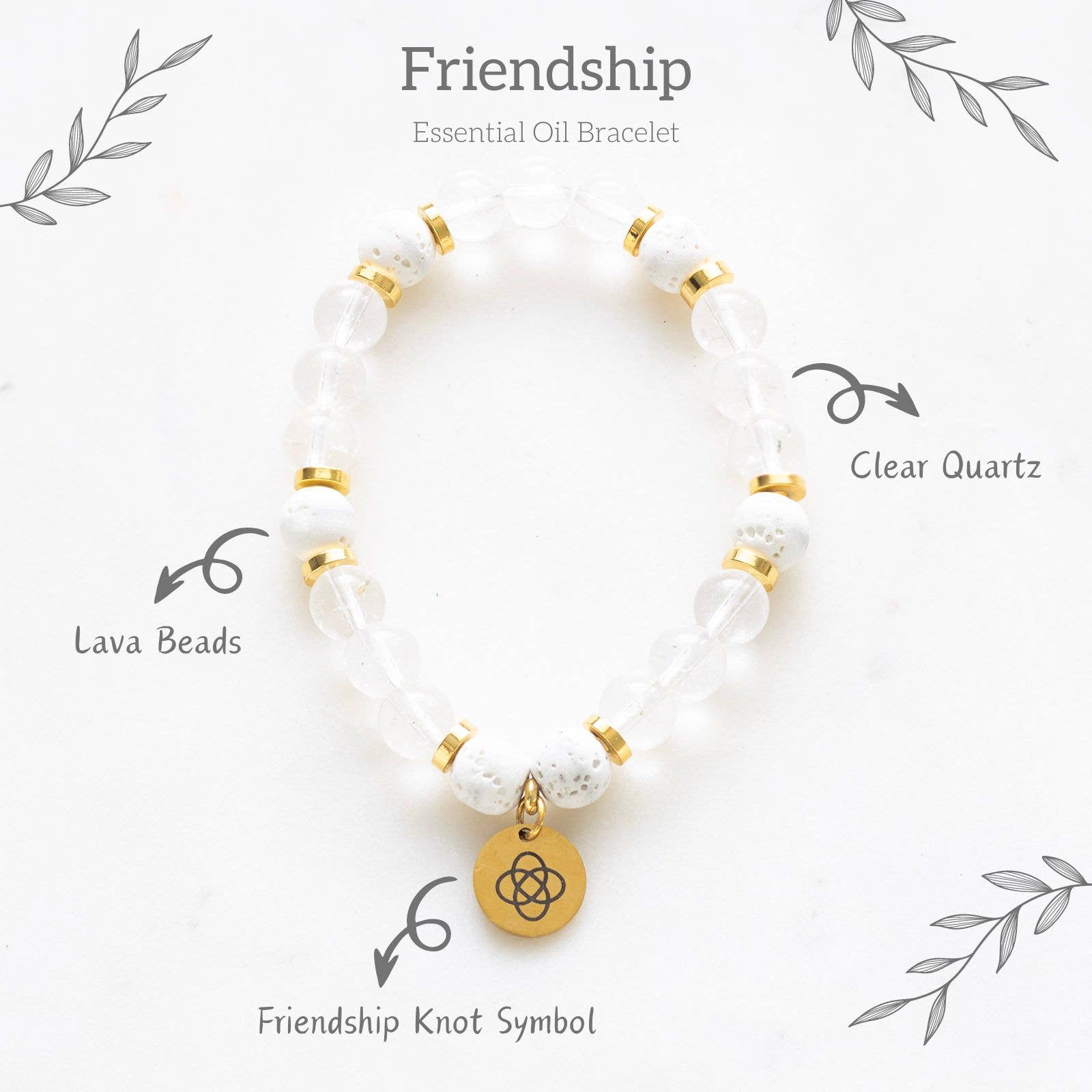 This friendship lava bead bracelet and essential oil gift set uses aromatherapy to enhance the metaphysical healing power of crystals. Crafted with natural clear quartz and lava beads, the bracelet serves as a diffuser for the included chamomile oil, offering protection and emotional stability. The addition of the Celtic friendship knot charm symbolises eternal love, loyalty, and faith, making it an ideal gift for cherished friendships. Crafted with durable materials and packaged in a luxury gift box, this elasticated bracelet combines beauty and functionality, offering a thoughtful present for various occasions. Designed by Something Different Wholesale.