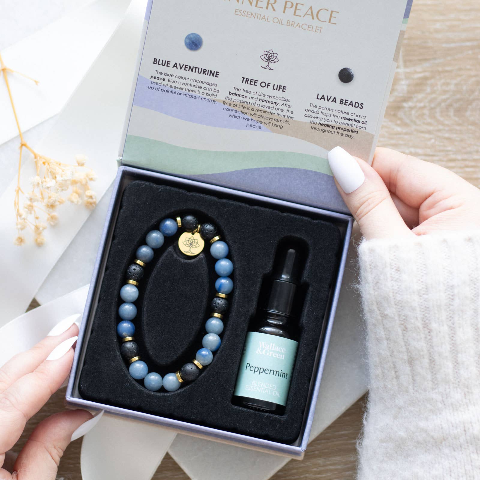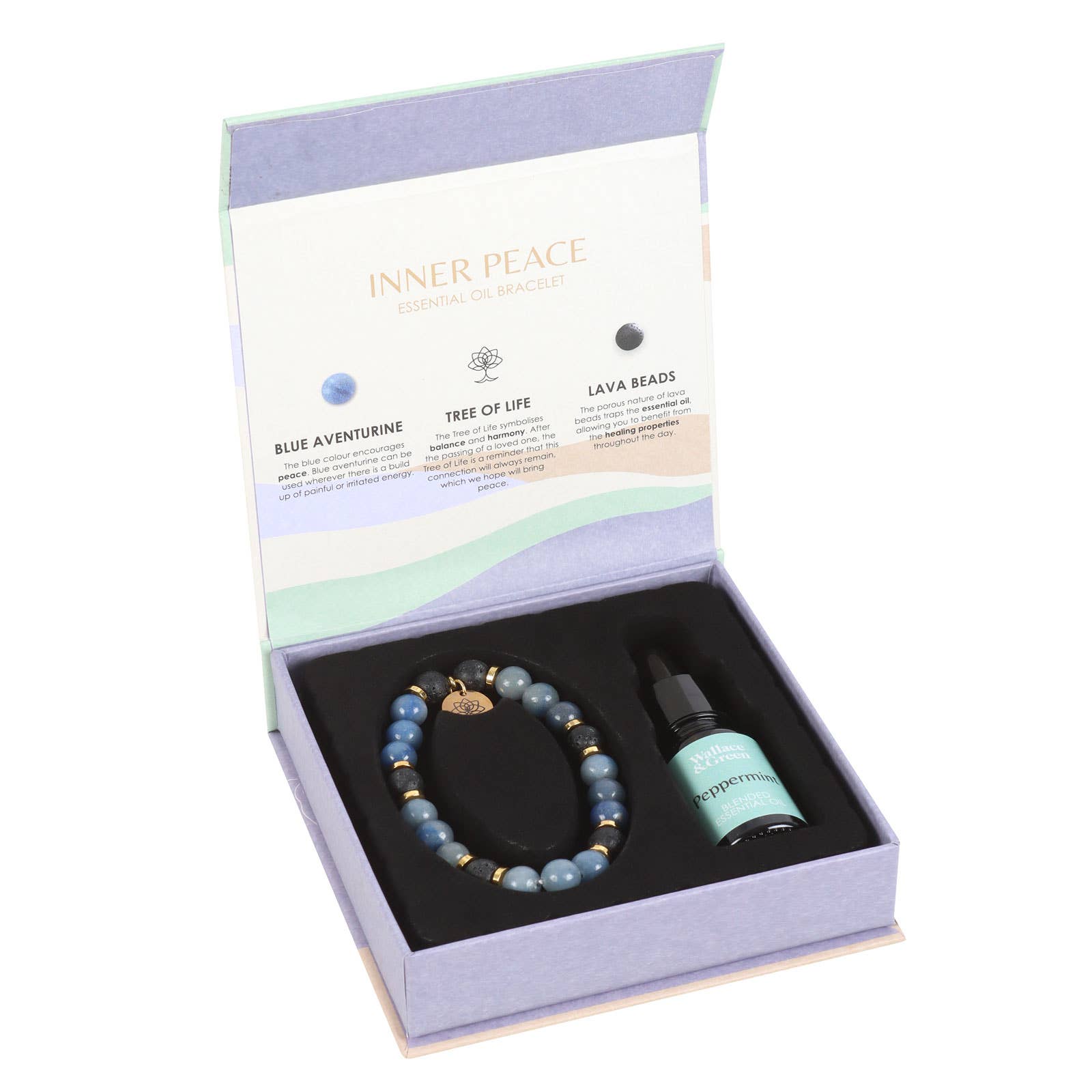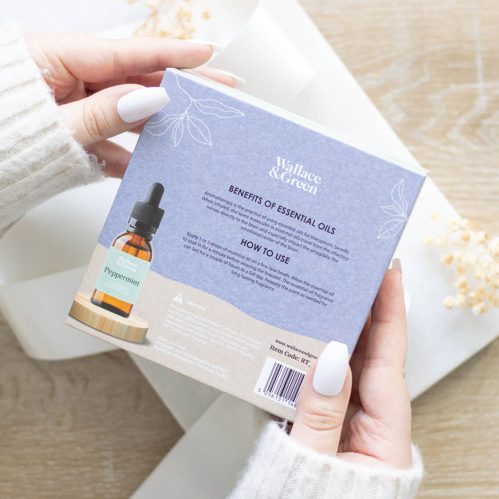 This inner peace lava bead bracelet and essential oil gift set uses aromatherapy to enhance the metaphysical healing power of crystals. Crafted with natural blue lace agate and lava beads, the bracelet serves as a diffuser for the included peppermint oil, promoting stress reduction and boosting energy. The addition of the tree of life charm symbolises growth and harmony, offers tranquility and serenity on the go. Crafted with durable materials and packaged in a luxury gift box, this elasticated bracelet combines beauty and functionality, offering a thoughtful present for various occasions. Designed by Something Different Wholesale.