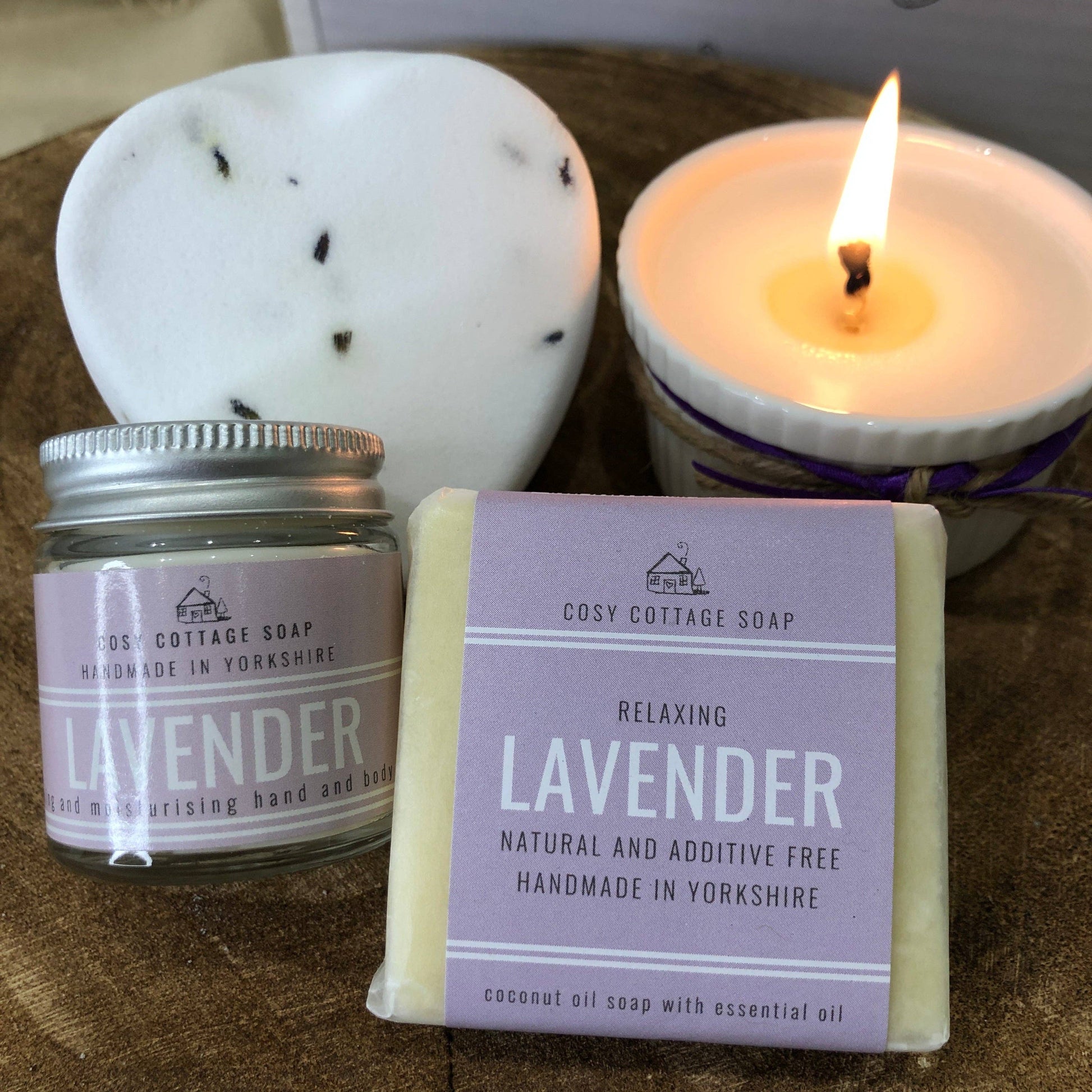 This collection includes four of our ever-popular lavender essential oil fragranced products; guaranteed to help you to relax and soak away the stresses of the day. Light your lavender candle, pop in your fizzy lavender heart-shaped bath bomb, grab a good book, soak and relax. Afterwards, moisturise with our long-lasting lavender fragranced hand and body cream
