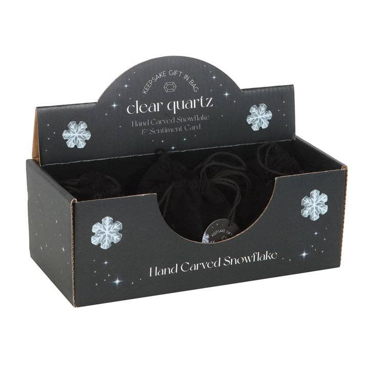 Add a touch of festive magic with this set of 12 clear quartz crystal snowflakes, beautifully presented in a matching display box. Hand-carved into snowflakes, each piece is crafted from clear quartz for attracting positive energy and balance. The crystal snowflake can be used to amplify festive spirits throughout the season. Perfect for decorating or gifting, this unique crystal comes in a matching velvet drawstring bag to be kept as a keepsake. As each crystal is unique, stone shape and colour may vary from photos shown. Designed by Something Different Wholesale and part of the Merry Crystalmas range of festive crystal gifts and decor.