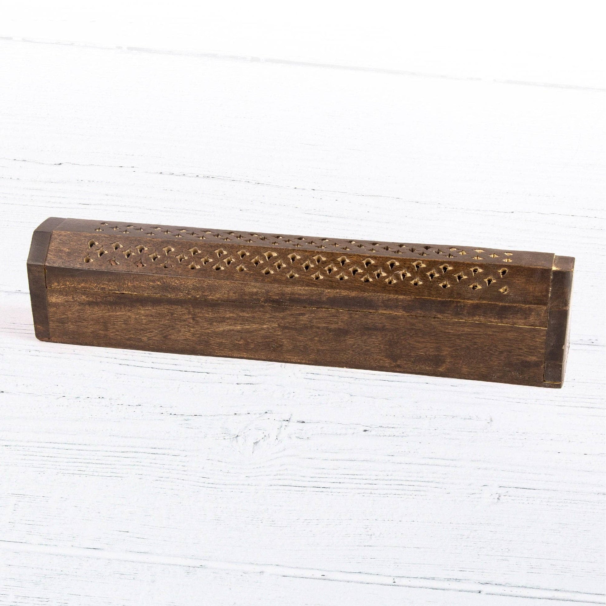 A beautiful wooden box carved into an incense storage ornament. The decorative box holds one piece of burning incense stick or cone at a time, making it an eye-catching piece of art while the fragrance rises gently through the many cutouts in the shape of diamonds.